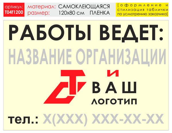 Баннер «Работы ведет», T04 (самоклеящаяся плёнка, 120х90 см) в Бердске купить
