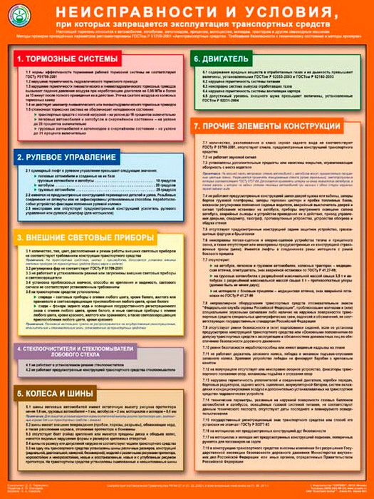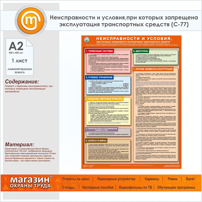 Плакат «Неисправности и условия, при которых запрещена эксплуатация транспортных средств» (С-77, ламинированная бумага, А2, 1 лист) в Бердске купить