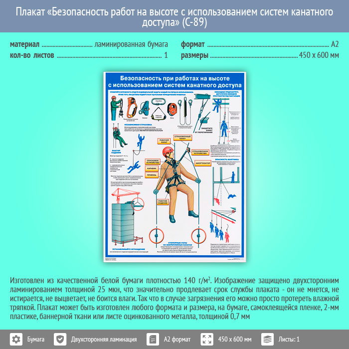 Плакат «Безопасность работ на высоте с использованием систем канатного доступа» (С-89, ламинированная бумага, А2, 1 лист) в Бердске купить