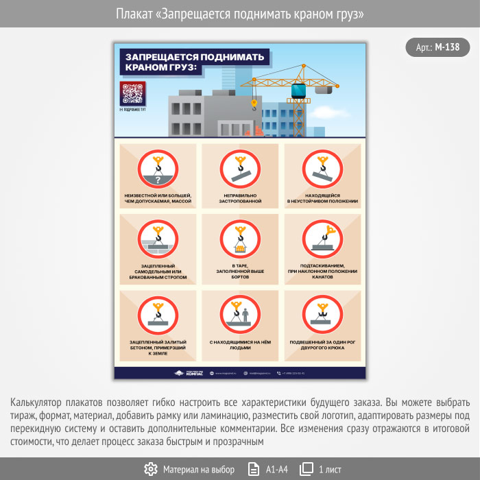 Плакат «Запрещается поднимать краном груз» с QR (М-138, 1 лист) в Бердске купить
