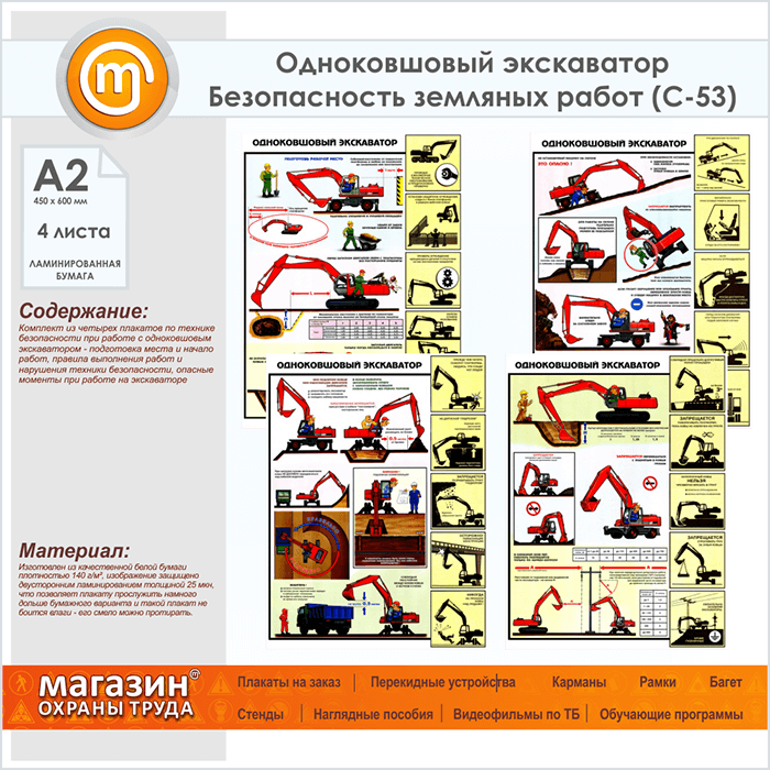 Плакаты «Одноковшовый экскаватор. Безопасность земляных работ» (С-53, ламинированная бумага, А2, 4 листа) в Бердске купить