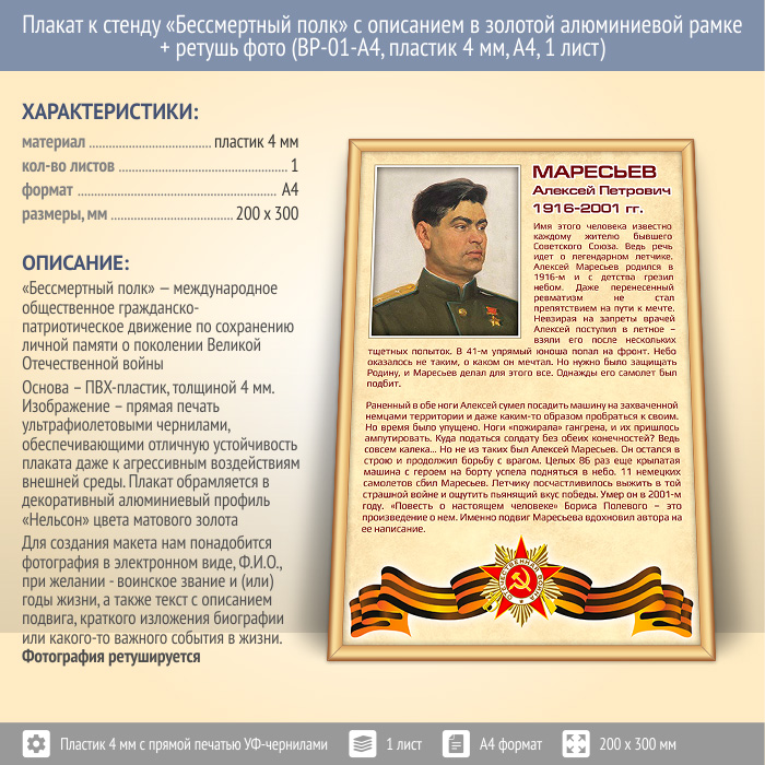 Плакат к стенду «Бессмертный полк» с описанием в золотой (матовой) алюминиевой рамке + ретушь фото (BP-02-A4, пластик 4 мм, А4, 1 лист) в Бердске купить