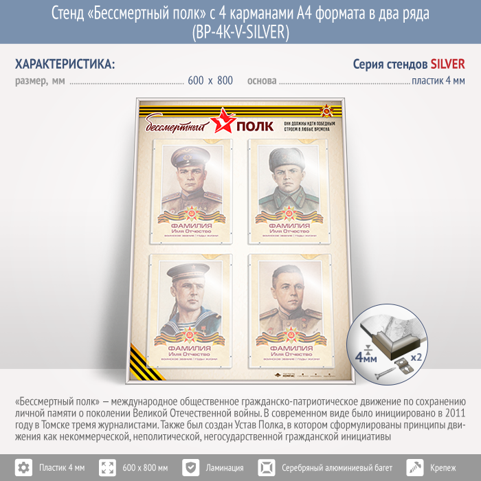 Стенд «Бессмертный полк» с 4 карманами А4 формата в два ряда (BP-4K-V-SILVER) в Бердске купить
