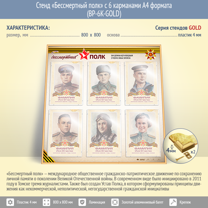 Стенд «Бессмертный полк» с 6 карманами А4 формата (BP-6K-GOLD) в Бердске купить