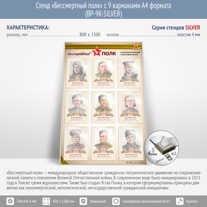 Стенд «Бессмертный полк» с 9 карманами А4 формата (BP-9K-SILVER) в Бердске купить