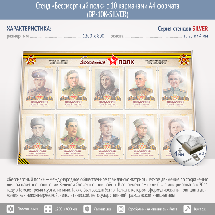 Стенд «Бессмертный полк» с 10 карманами А4 формата (BP-10K-SILVER) в Бердске купить