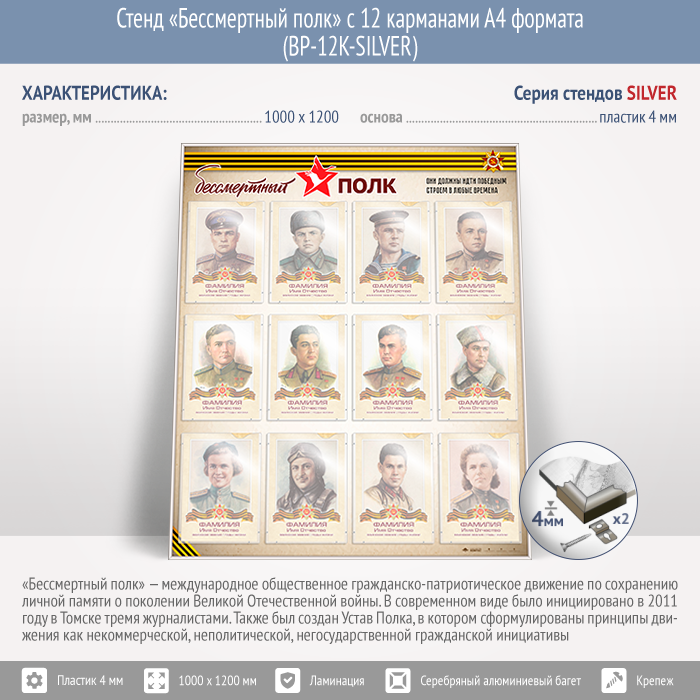 Стенд «Бессмертный полк» с 12 карманами А4 формата (BP-12K-SILVER) в Бердске купить