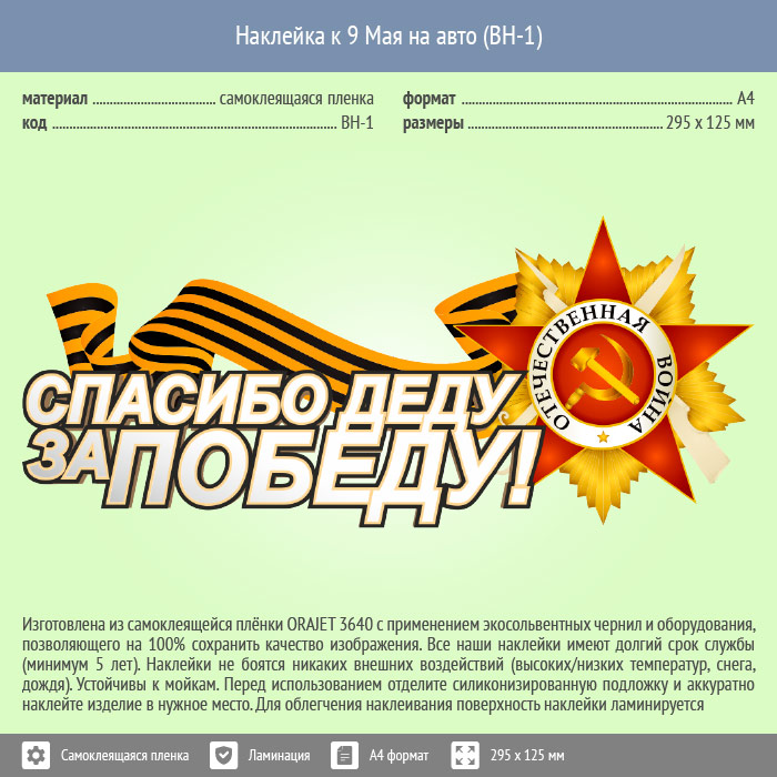Наклейка к 9 Мая на авто А4 формата (BH-1) в Бердске купить