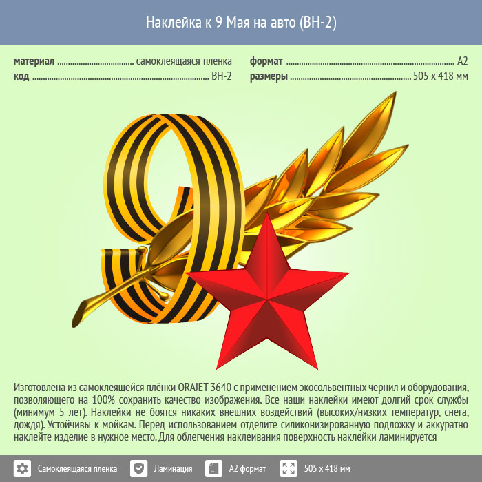 Наклейка к 9 Мая на авто А2 формата (BH-2) в Бердске купить