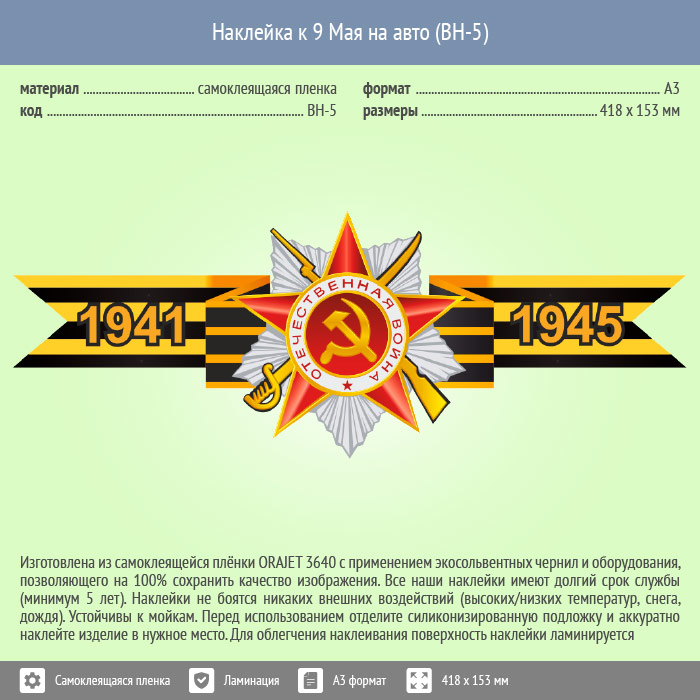 Наклейка к 9 Мая на авто А3 формата (BH-5) в Бердске купить