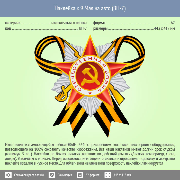 Наклейка к 9 Мая на авто А2 формата (BH-7) в Бердске купить