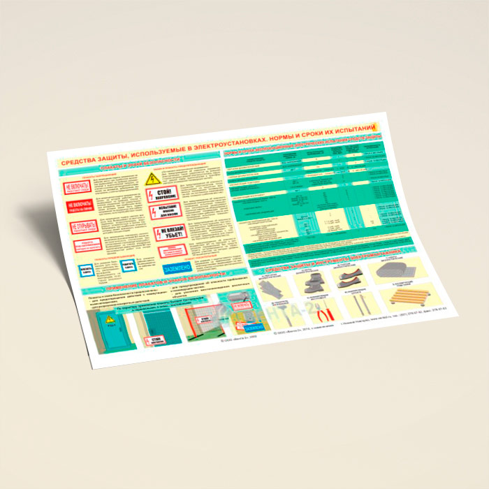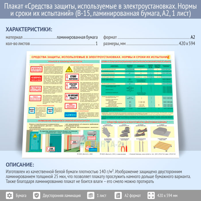 Плакат «Средства защиты, используемые в электроустановках. Нормы и сроки их испытаний» (В-15, ламинированная бумага, А2, 1 лист) в Бердске купить