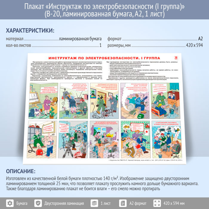 Плакат «Инструктаж по электробезопасности (I группа)» (В-20, ламинированная бумага, А2, 1 лист) в Бердске купить