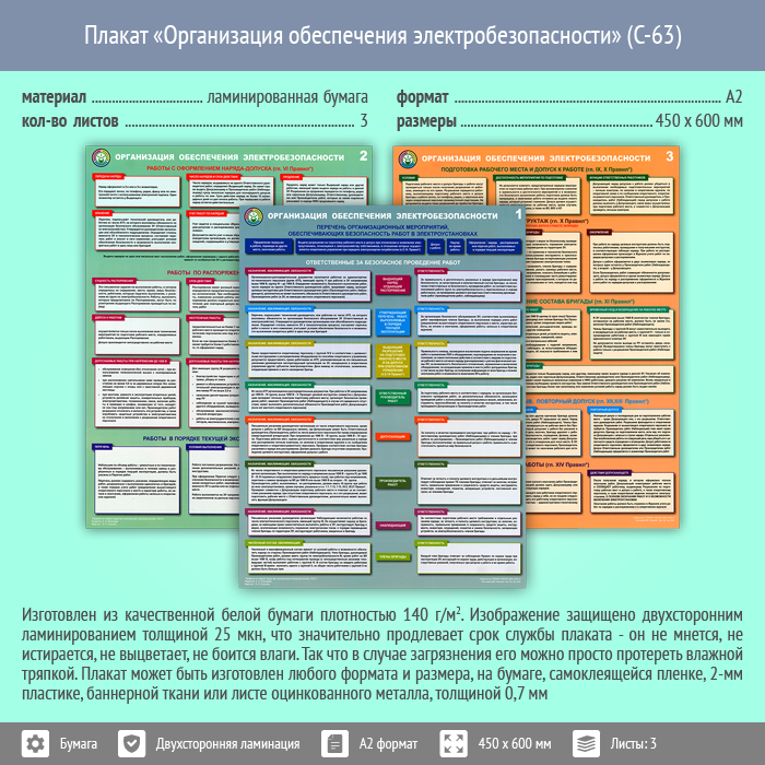 Плакаты «Организация обеспечения электробезопасности» (С-63, ламинированная бумага, А2, 3 листа) в Бердске купить