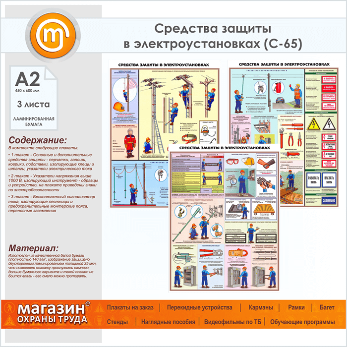 Плакаты «Средства защиты в электроустановках» (С-65, ламинированная бумага, А2, 3 листа) в Бердске купить