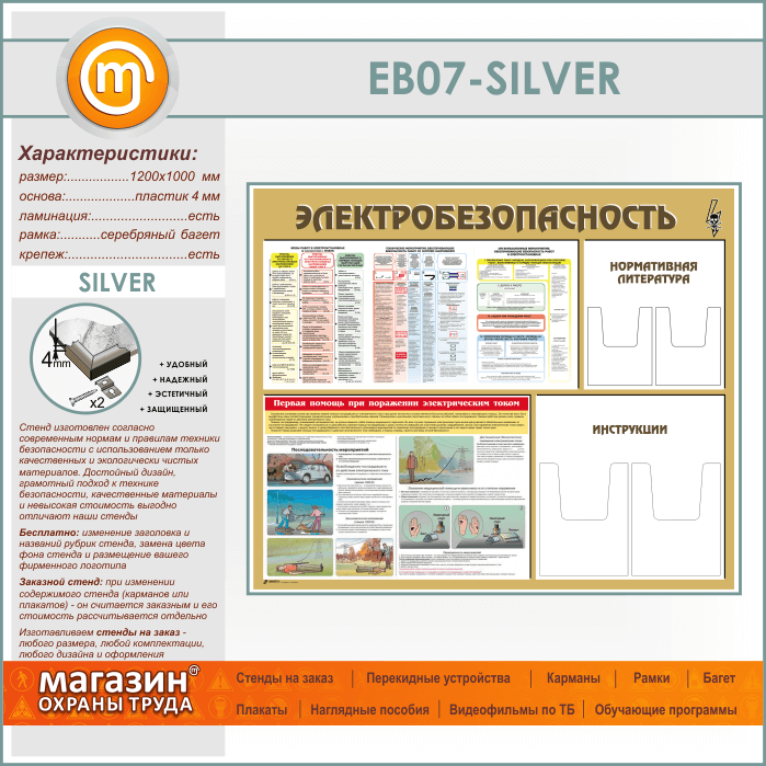 Стенд «Электробезопасность» с 4 объемными карманами (EB-07-SILVER) в Бердске купить