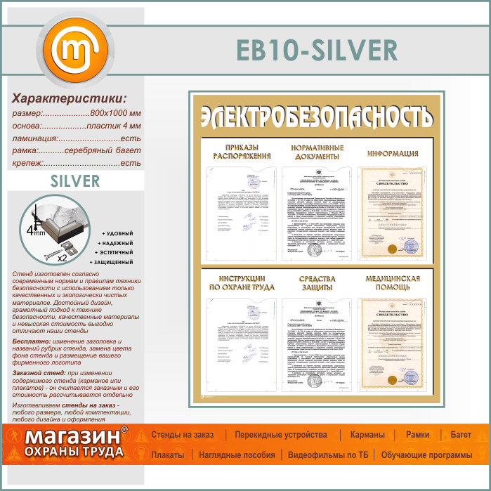 Стенд «Электробезопасность» с 6 карманами (EB-10-SILVER) в Бердске купить