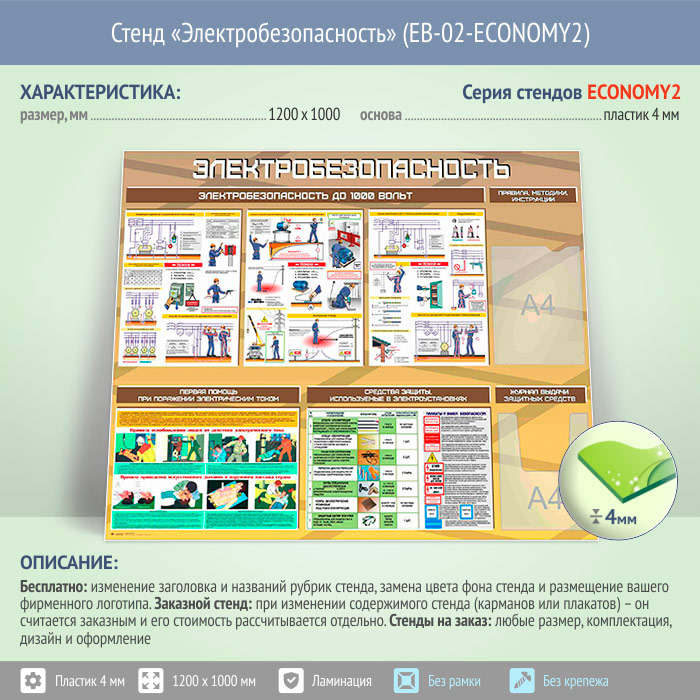 Стенд «Электробезопасность до 1000 вольт» с плоским и объемным карманами (EB-02-ECONOMY2) в Бердске купить