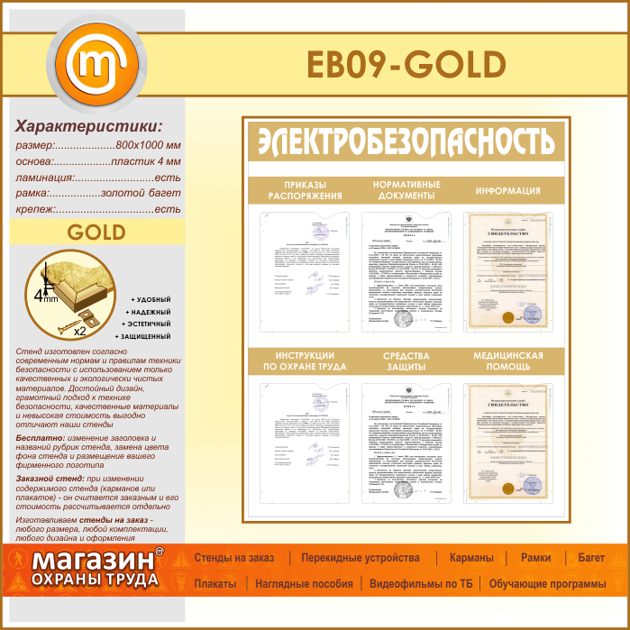 Стенд «Электробезопасность» с 6 карманами (EB-09-GOLD) в Бердске купить