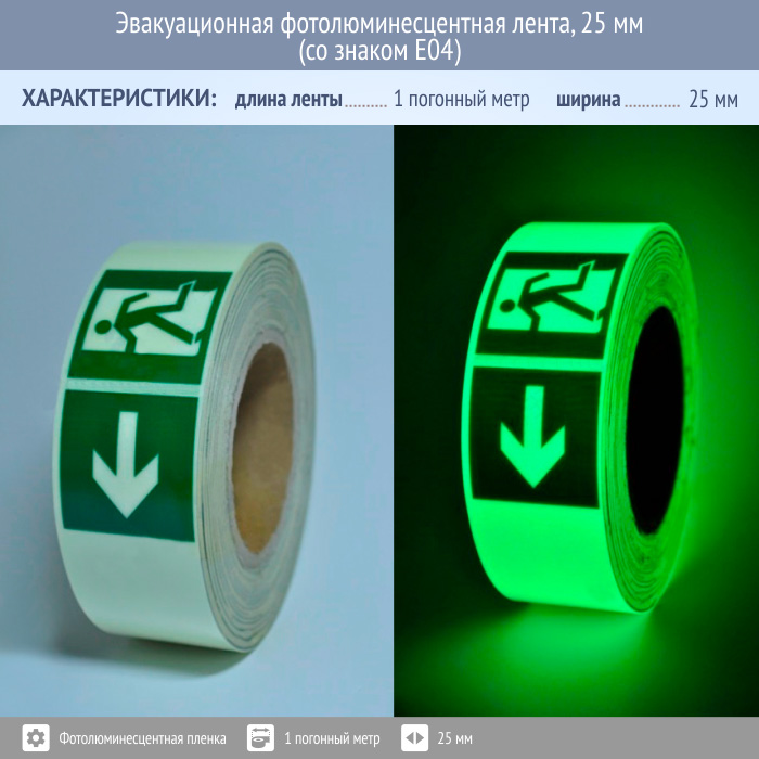 Представляет собой ленту из самоклеящейся фотолюминесцентной (светонакапливающей) плёнки с изображением периодически повторяющегося знака Е04 – направление к эвакуационному выходу налево. Применяется для дополнительного обозначения путей эвакуации