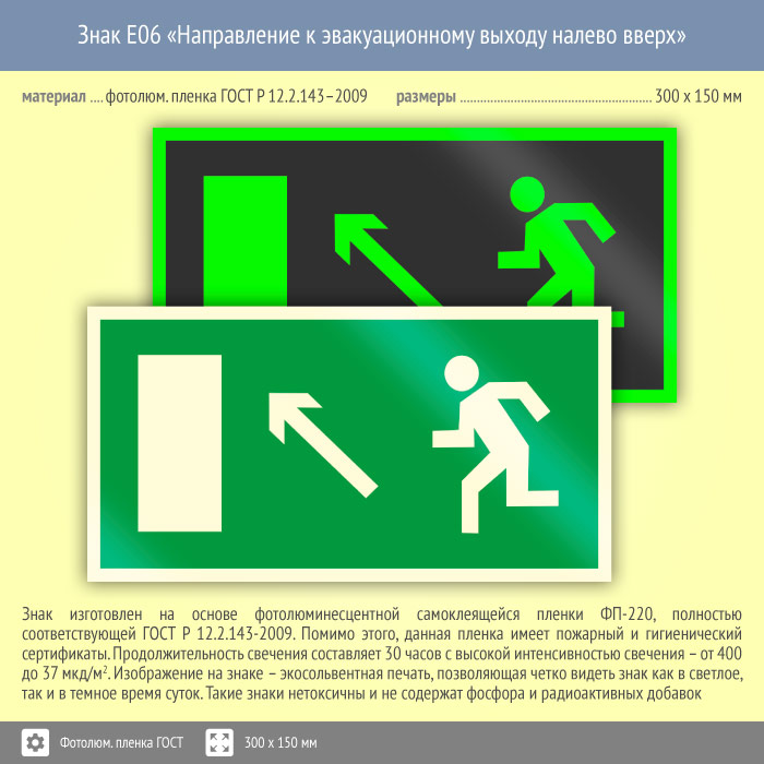 Знак E06 «Направление к эвакуационному выходу налево вверх» (фотолюминесцентная пленка ГОСТ 34428-2018, 300х150 мм) в Бердске купить