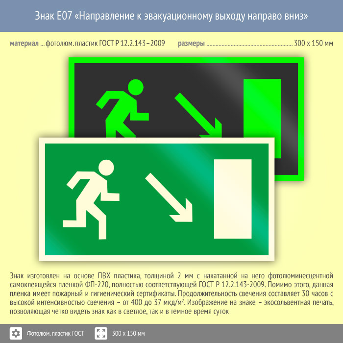 Знак E07 «Направление к эвакуационному выходу направо вниз» (фотолюминесцентный пластик ГОСТ 34428-2018, 300х150 мм) в Бердске купить