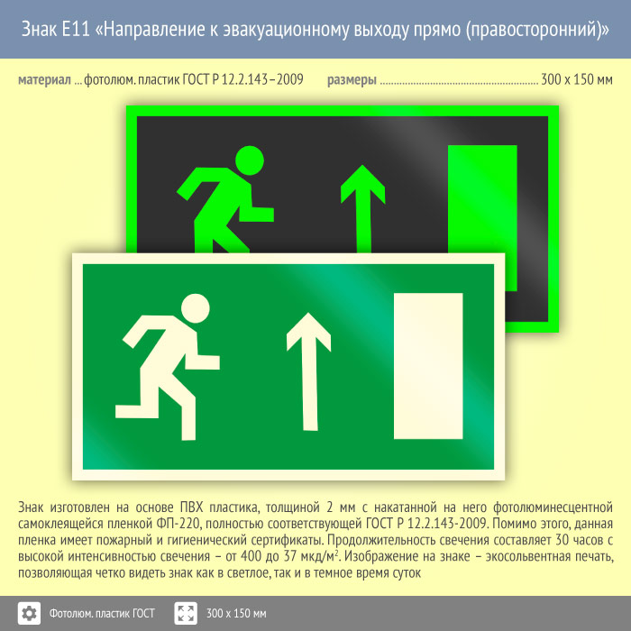 Знак E11 «Направление к эвакуационному выходу прямо (правосторонний)» (фотолюминесцентный пластик ГОСТ 34428-2018, 300х150 мм) в Бердске купить