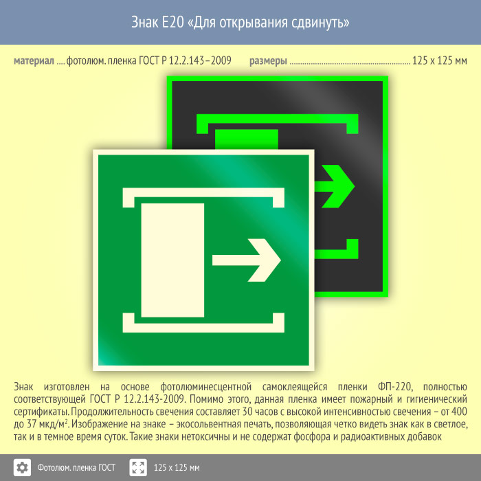 Знак E20 «Для открывания сдвинуть» (фотолюминесцентный пластик ГОСТ 34428-2018, 125х125 мм) в Бердске купить