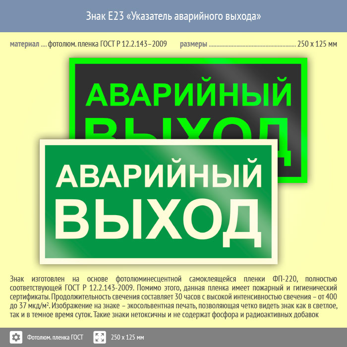 Знак E23 «Указатель аварийного выхода» (фотолюминесцентная пленка ГОСТ 34428-2018, 250х125 мм) в Бердске купить