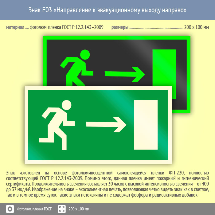 Знак E03 «Направление к эвакуационному выходу направо» (фотолюминесцентная пленка ГОСТ 34428-2018, 200х100 мм) в Бердске купить
