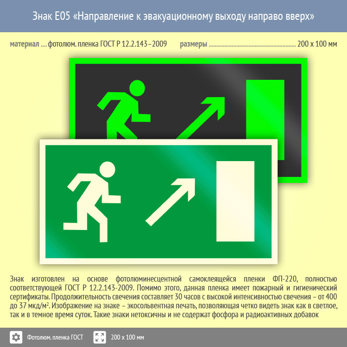 Знак E05 «Направление к эвакуационному выходу направо вверх» (фотолюминесцентная пленка ГОСТ 34428-2018, 200х100 мм) в Бердске купить