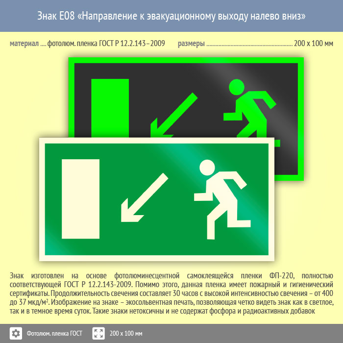 Знак E08 «Направление к эвакуационному выходу налево вниз» (фотолюминесцентная пленка ГОСТ 34428-2018, 200х100 мм) в Бердске купить