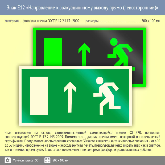 Знак E12 «Направление к эвакуационному выходу прямо (левосторонний)» (фотолюминесцентная пленка ГОСТ 34428-2018, 200х100 мм) в Бердске купить