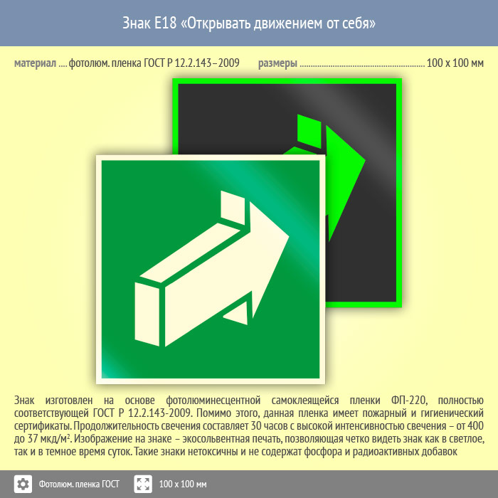 Знак E18 «Открывать движением от себя» (фотолюминесцентная пленка ГОСТ 34428-2018, 100х100 мм) в Бердске купить