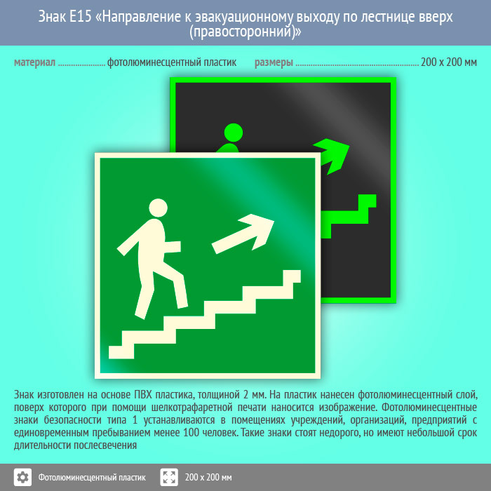 Знак E15 «Направление к эвакуационному выходу по лестнице вверх (правосторонний)» (фотолюминесцентный пластик, 200х200 мм) в Бердске купить