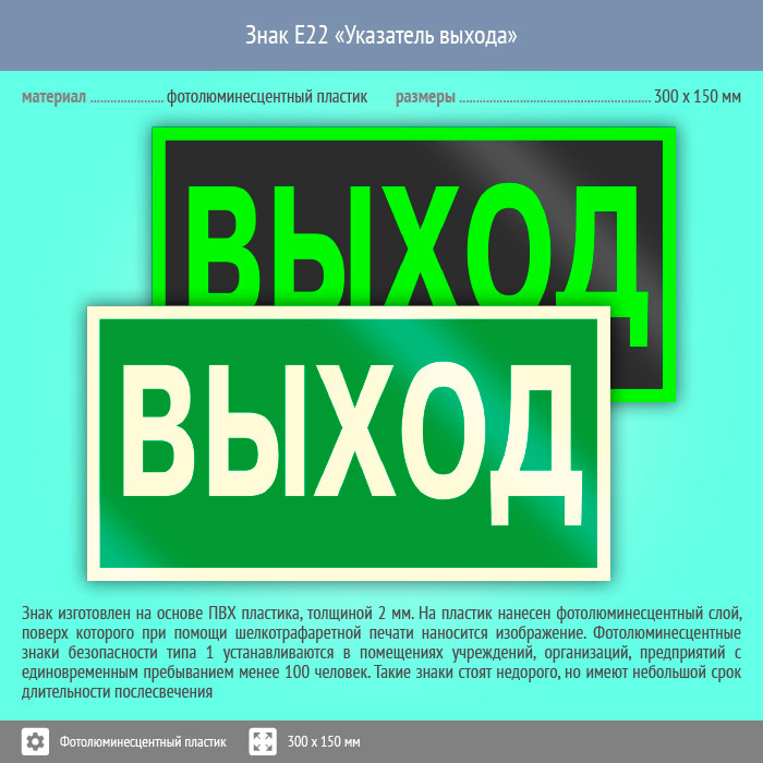 Знак E22 «Указатель выхода» (фотолюминесцентный пластик, 300х150 мм) в Бердске купить