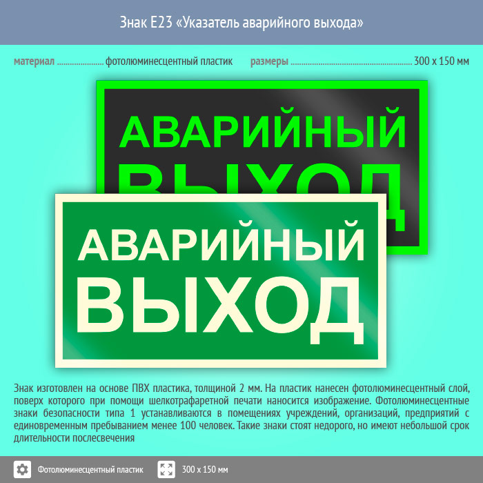 Знак E23 «Указатель аварийного выхода» (фотолюминесцентный пластик, 300х150 мм) в Бердске купить