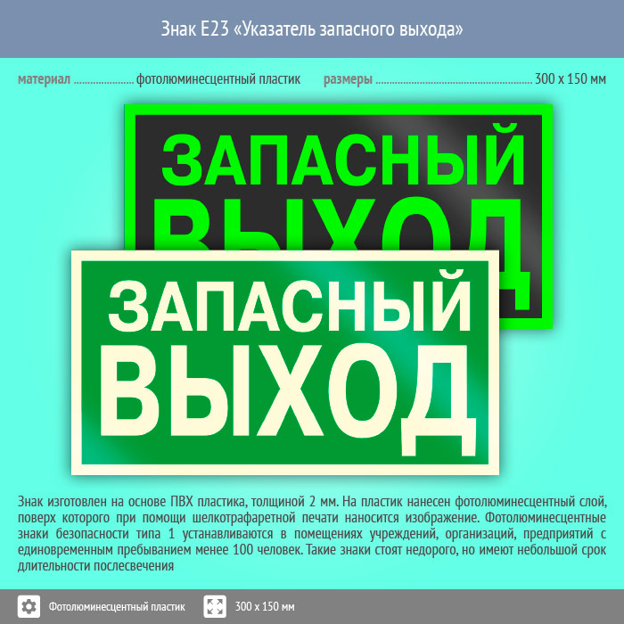 Знак E23 «Указатель запасного выхода» (устаревший) (фотолюминесцентный пластик, 300х150 мм) в Бердске купить