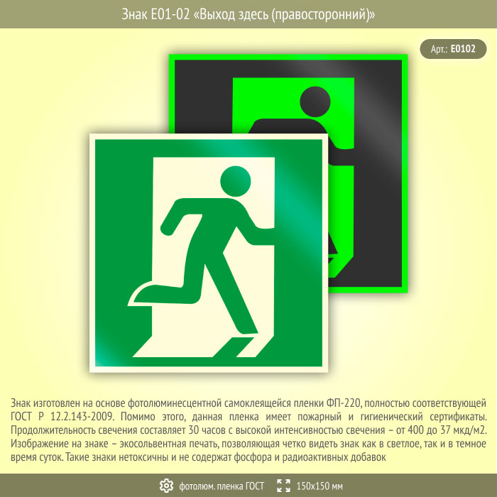 Знак E01-02 «Выход здесь (правосторонний)» (фотолюминесцентная пленка ГОСТ 34428-2018, 150х150 мм) в Бердске купить
