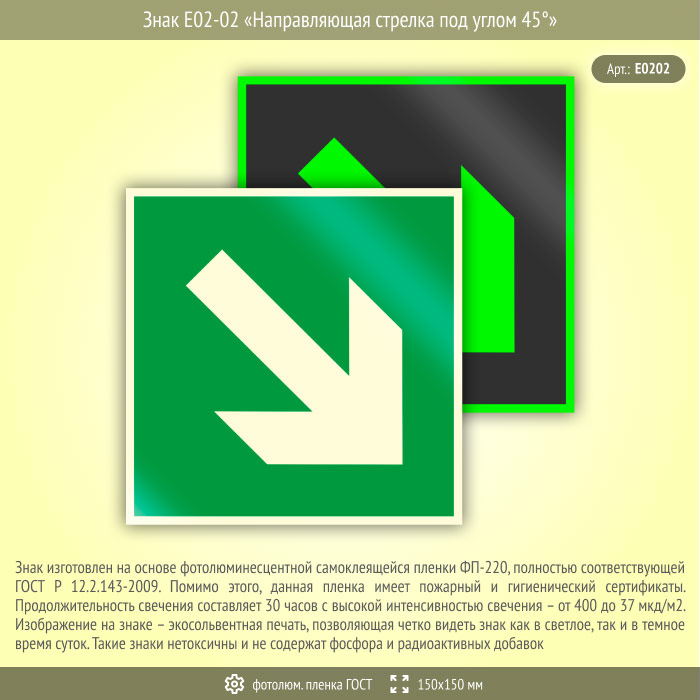 Знак E02-02 «Направляющая стрелка под углом 45°» (фотолюминесцентная пленка ГОСТ 34428-2018, 150х150 мм) в Бердске купить