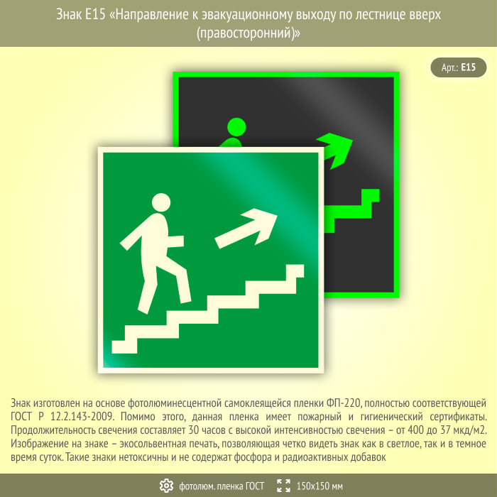 Знак E15 «Направление к эвакуационному выходу по лестнице вверх (правосторонний)» (фотолюминесцентная пленка ГОСТ 34428-2018, 150х150 мм) в Бердске купить