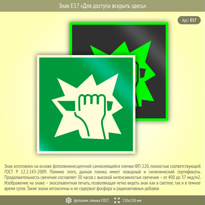 Знак E17 «Для доступа вскрыть здесь» (фотолюминесцентная пленка ГОСТ 34428-2018, 150х150 мм) в Бердске купить