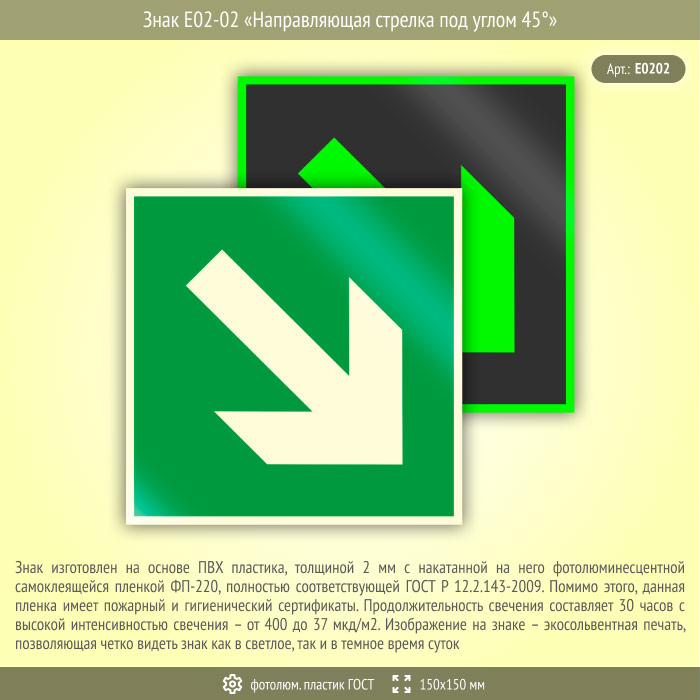 Знак E02-02 «Направляющая стрелка под углом 45°» (фотолюминесцентный пластик ГОСТ 34428-2018, 150х150 мм) в Бердске купить