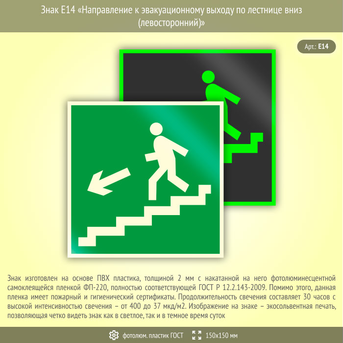 Знак E14 «Направление к эвакуационному выходу по лестнице вниз (левосторонний)» (фотолюминесцентный пластик ГОСТ 34428-2018, 150х150 мм) в Бердске купить