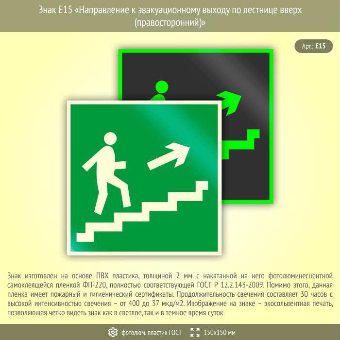 Знак E15 «Направление к эвакуационному выходу по лестнице вверх (правосторонний)» (фотолюминесцентный пластик ГОСТ 34428-2018, 150х150 мм) в Бердске купить
