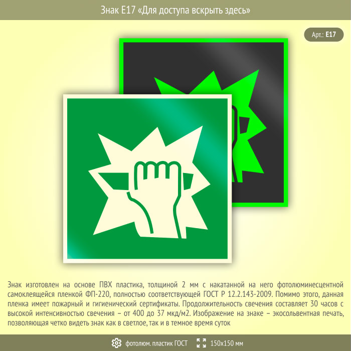 Знак E17 «Для доступа вскрыть здесь» (фотолюминесцентный пластик ГОСТ 34428-2018, 150х150 мм) в Бердске купить