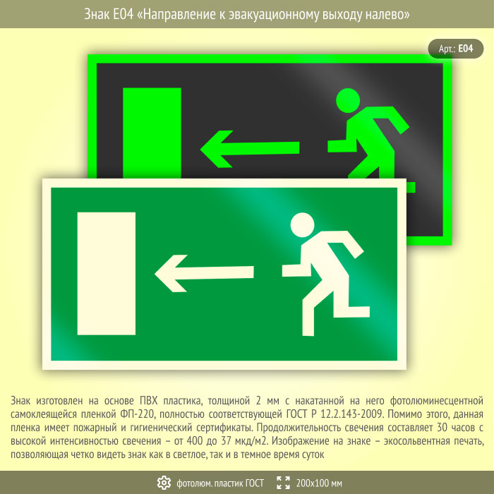 Знак E04 «Направление к эвакуационному выходу налево» (фотолюминесцентный пластик ГОСТ 34428-2018, 200х100 мм) в Бердске купить