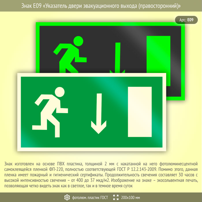 Знак E09 «Указатель двери эвакуационного выхода (правосторонний)» (фотолюминесцентный пластик ГОСТ 34428-2018, 200х100 мм) в Бердске купить