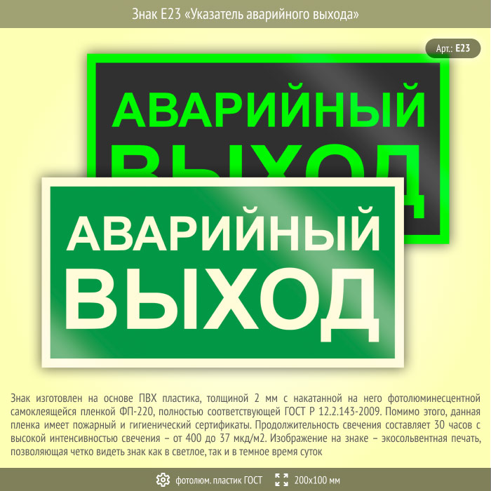 Знак E23 «Указатель аварийного выхода» (фотолюминесцентный пластик ГОСТ 34428-2018, 200х100 мм) в Бердске купить