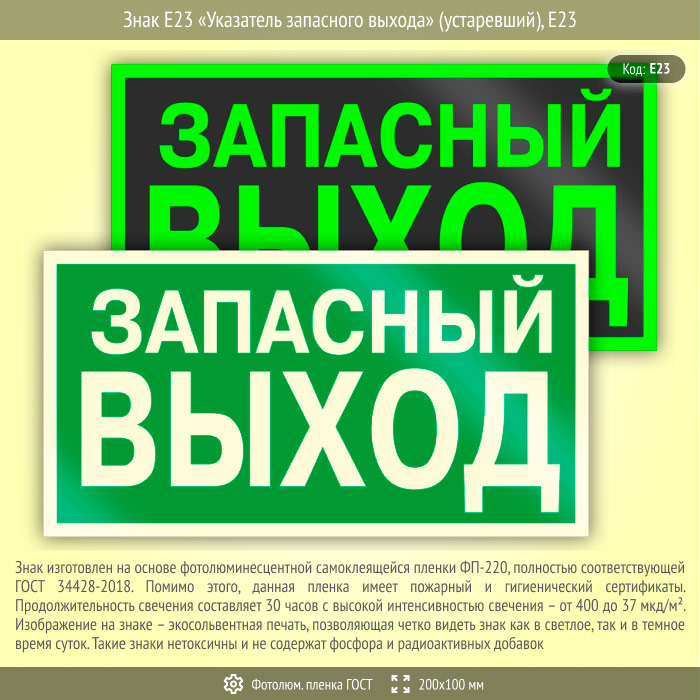 Знак E23 «Указатель запасного выхода» (устаревший) (фотолюминесцентная пленка ГОСТ 34428-2018, 200х100 мм) в Бердске купить